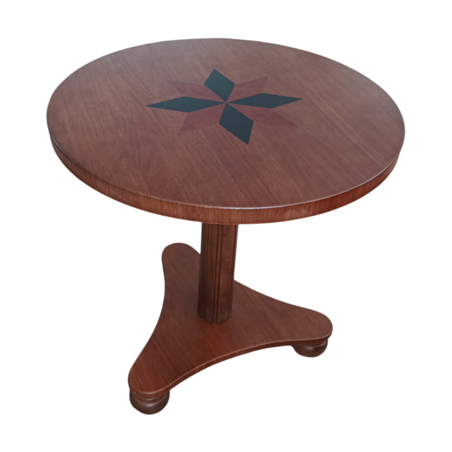 The Aurora Solid Wood Accent Table is a handcrafted piece that highlights the natural beauty of solid wood. Featuring a round tabletop with elegant inlay detailing, this table brings warmth, character, and artisanal craftsmanship into any interior space. Its timeless design makes it ideal as a side table, accent table, or compact coffee table.