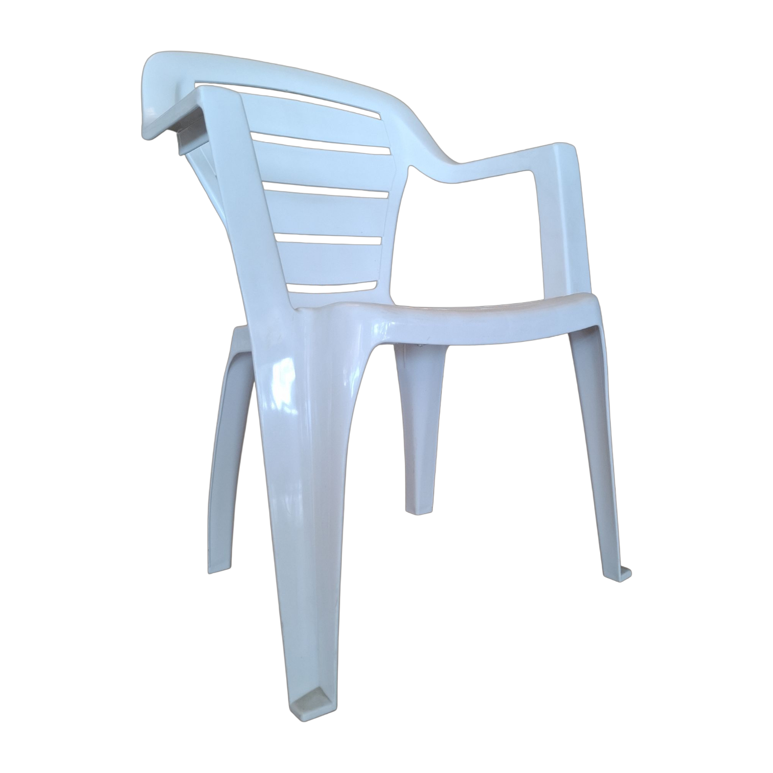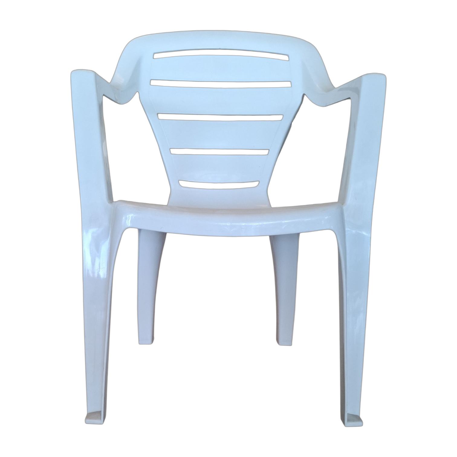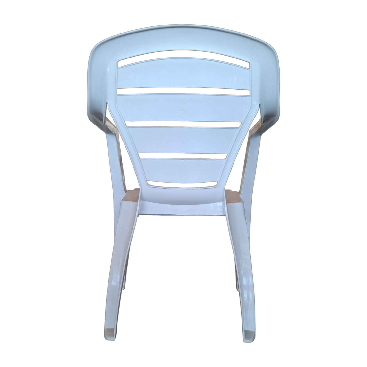 Lightweight and practical, the Calafell Armchair in white is made from durable plastic, offering strength and easy maintenance. Its slatted backrest and armrests provide comfort and ventilation for extended use.