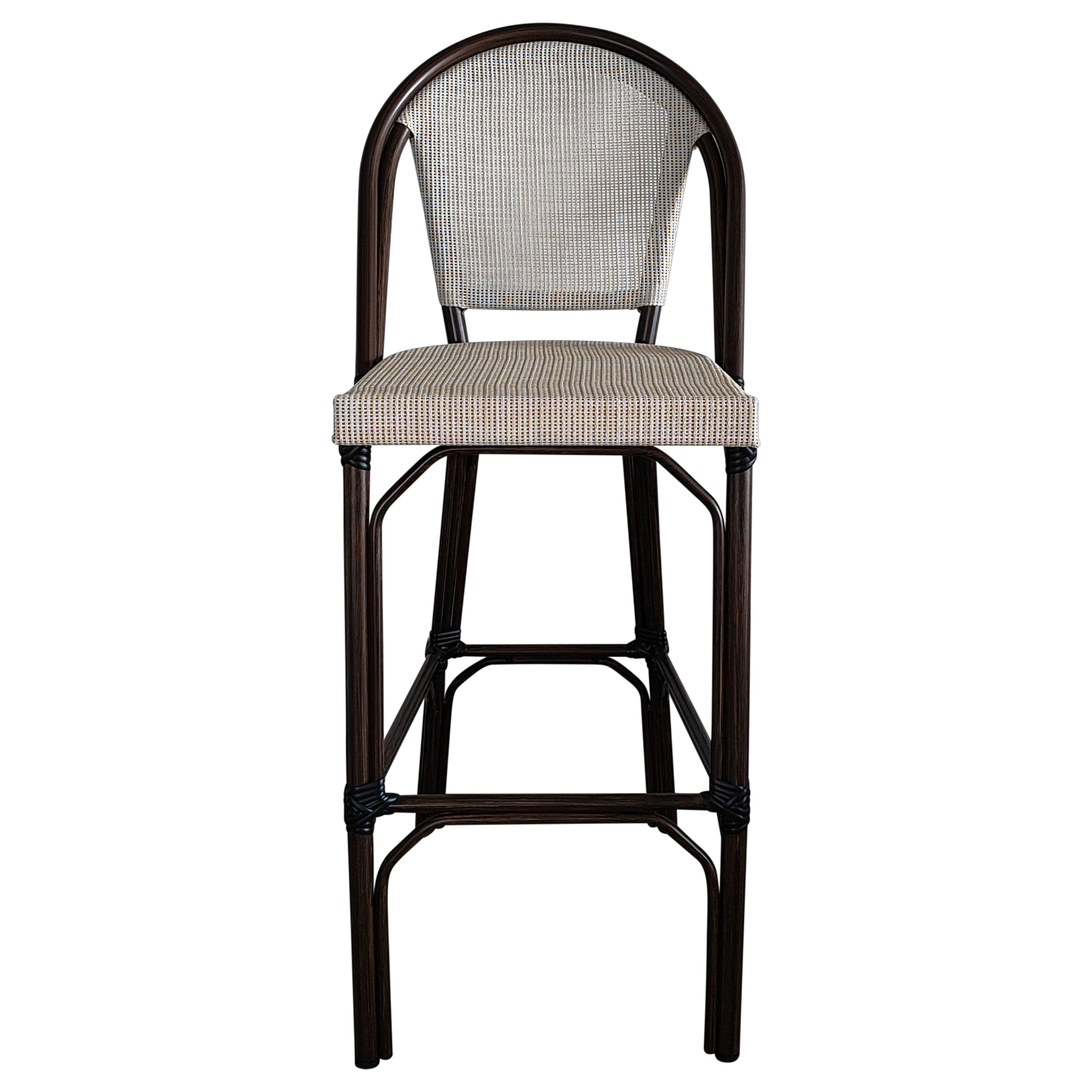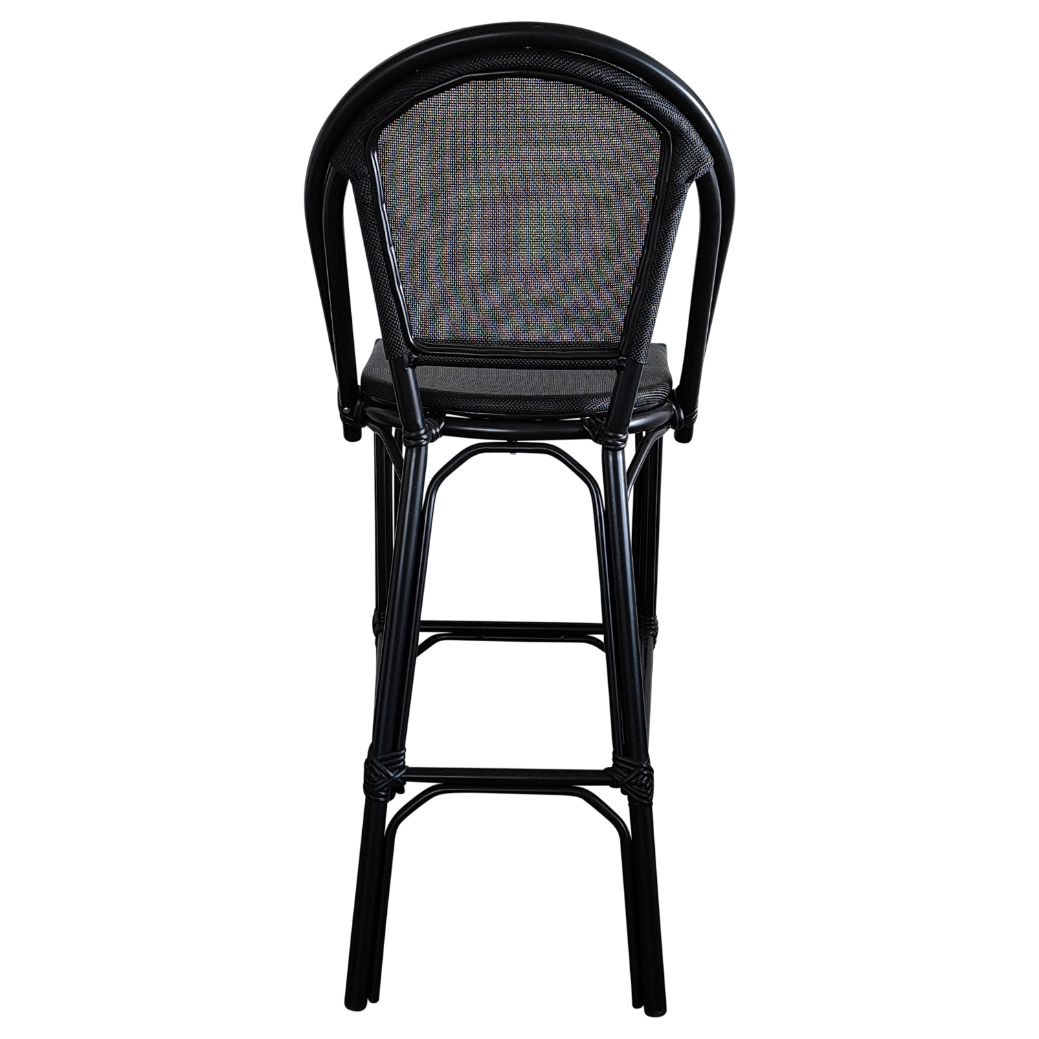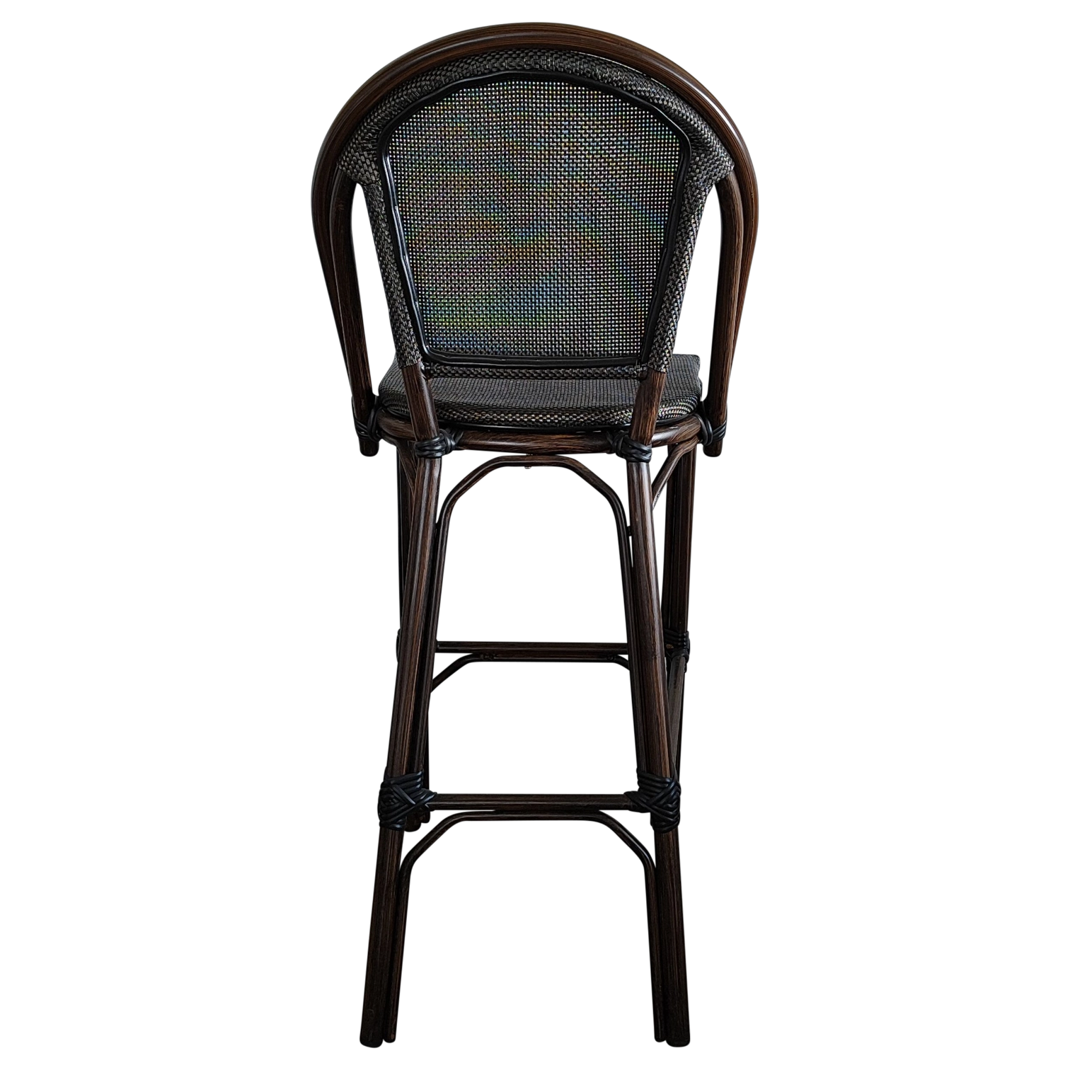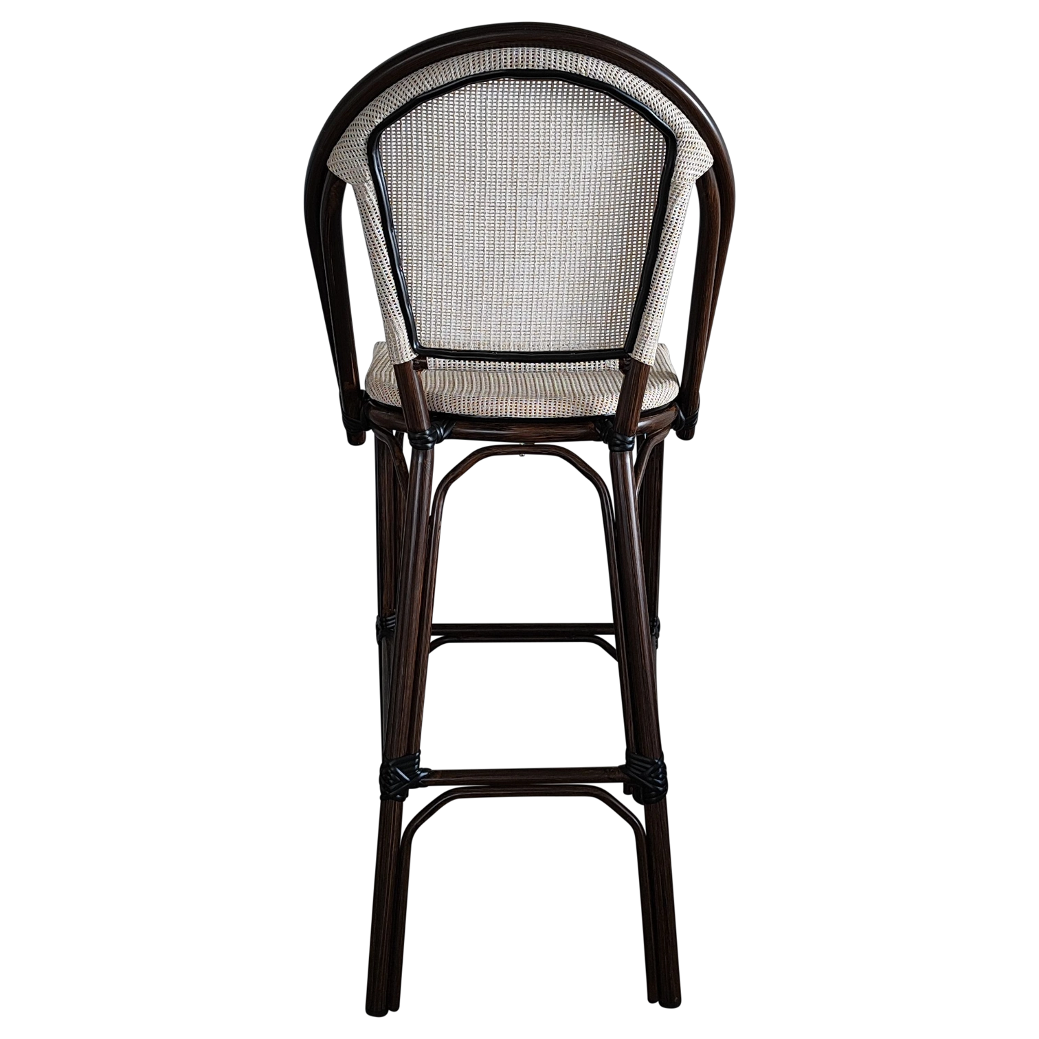 JENA Stool — Stylish rattan-look bar stool with a woven back and seat. Ideal for cafés, bars, and outdoor areas, offering both comfort and charm.