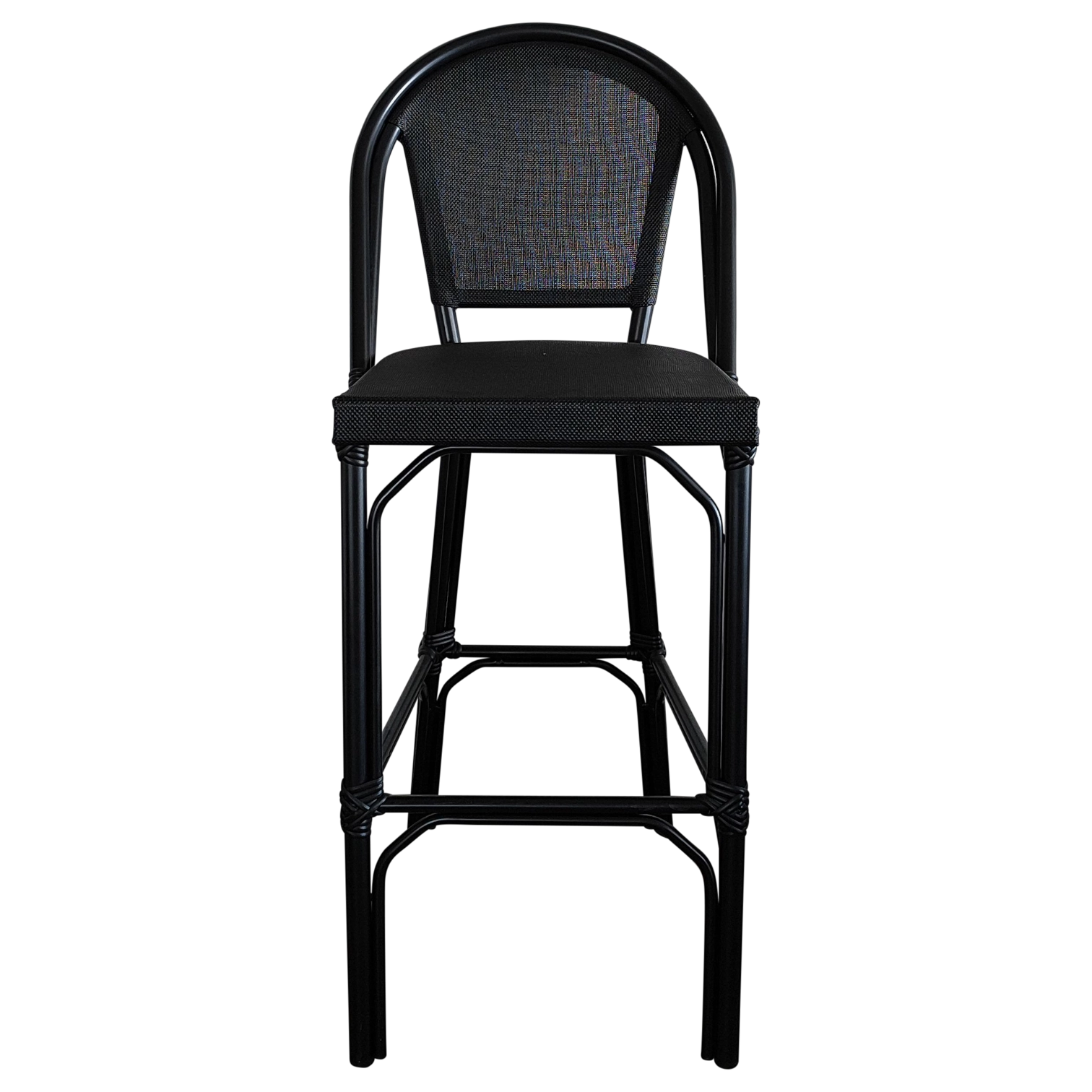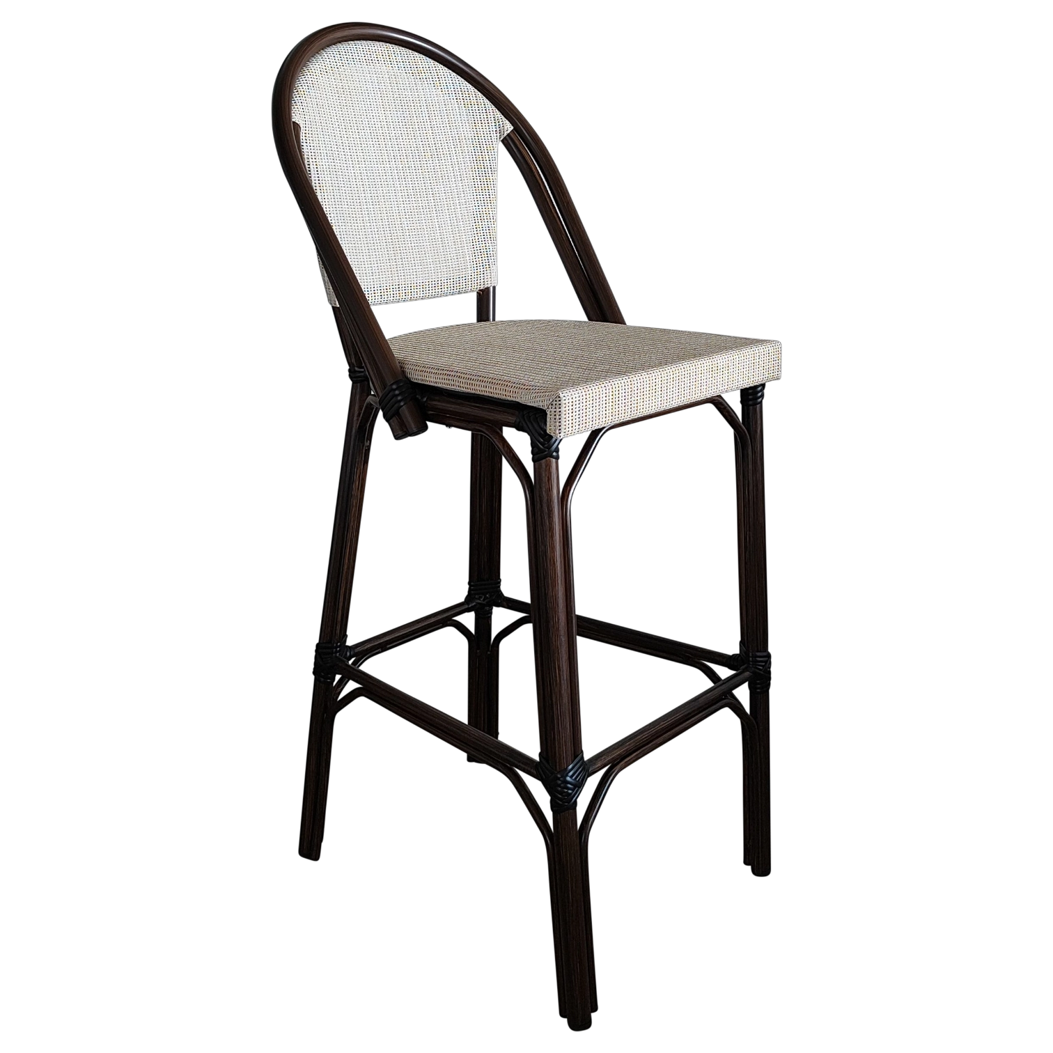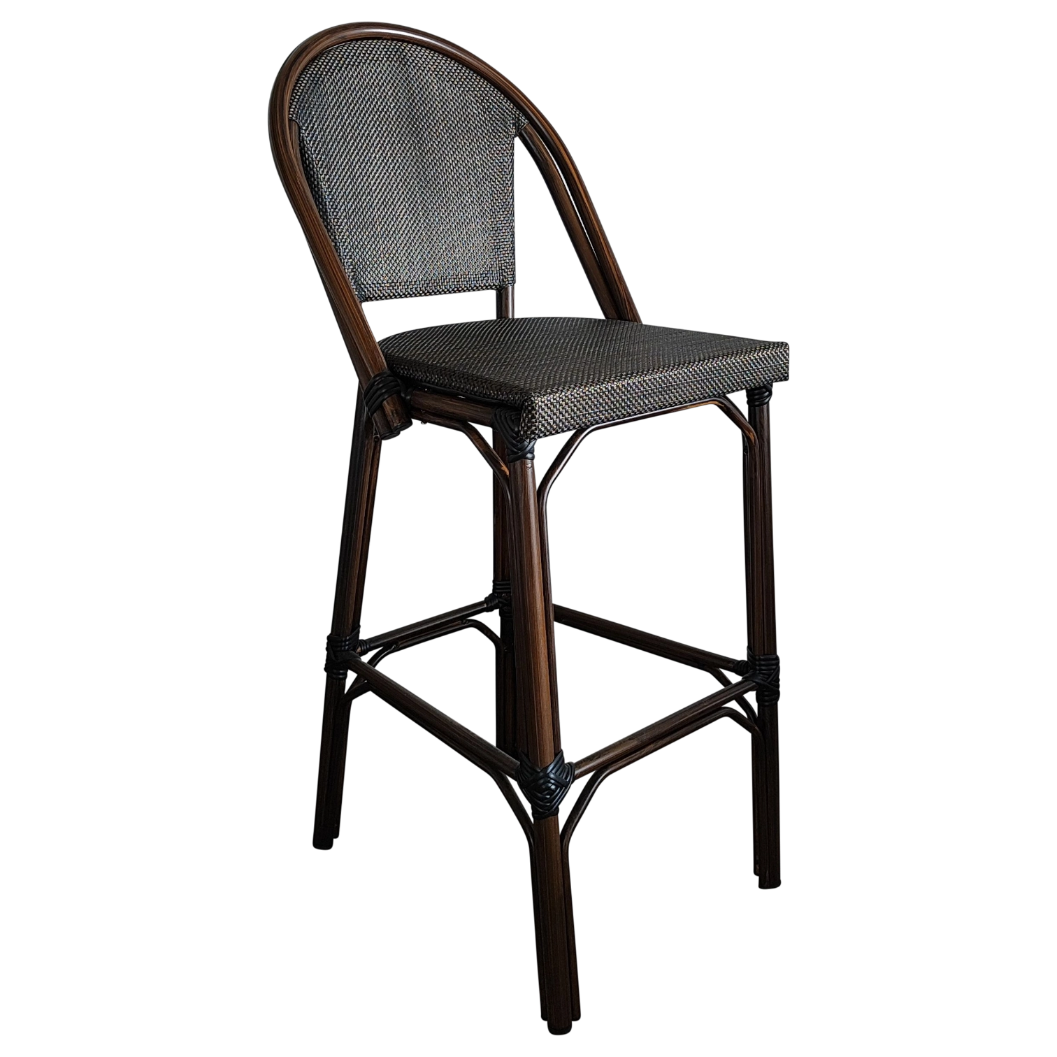 JENA Stool — Stylish rattan-look bar stool with a woven back and seat. Ideal for cafés, bars, and outdoor areas, offering both comfort and charm.