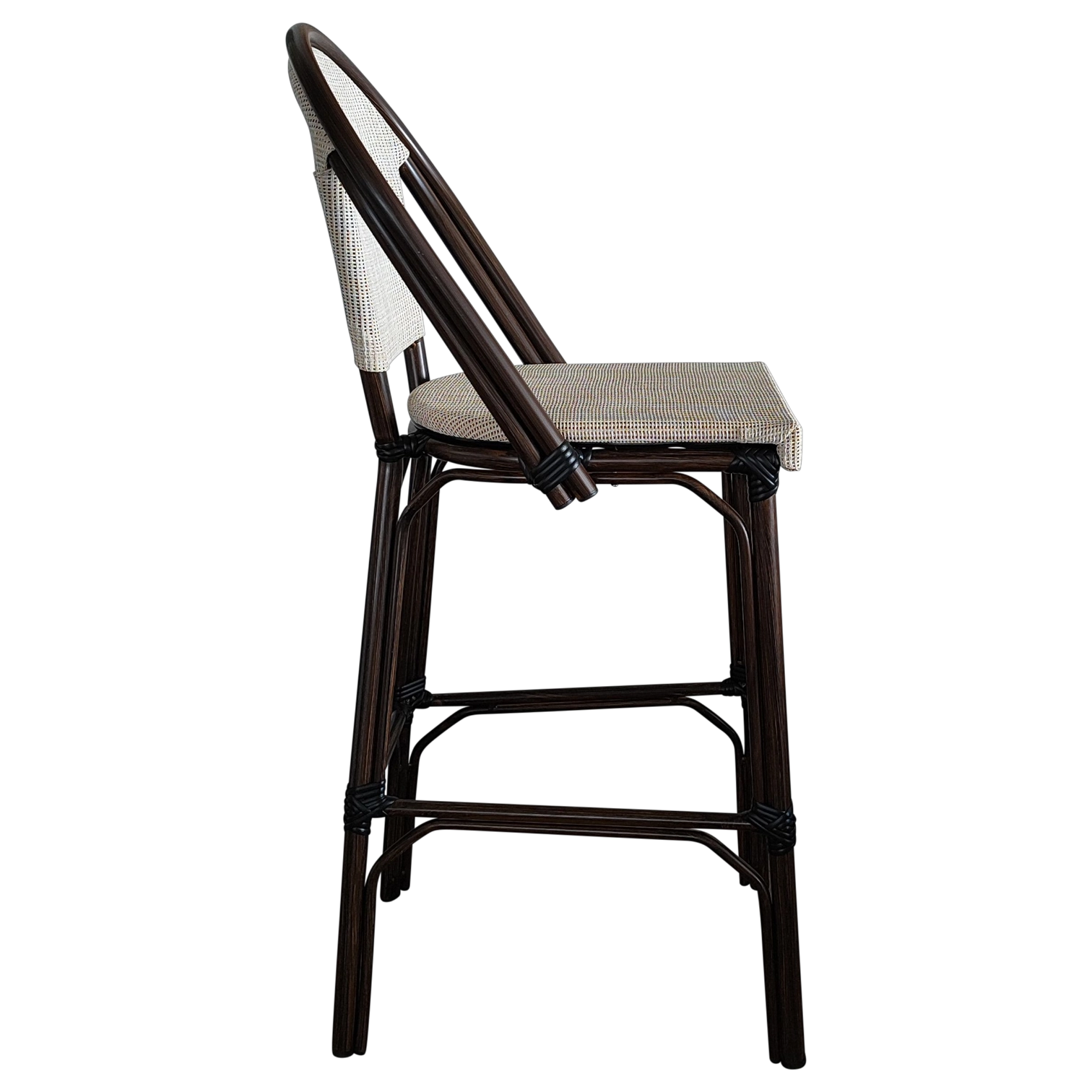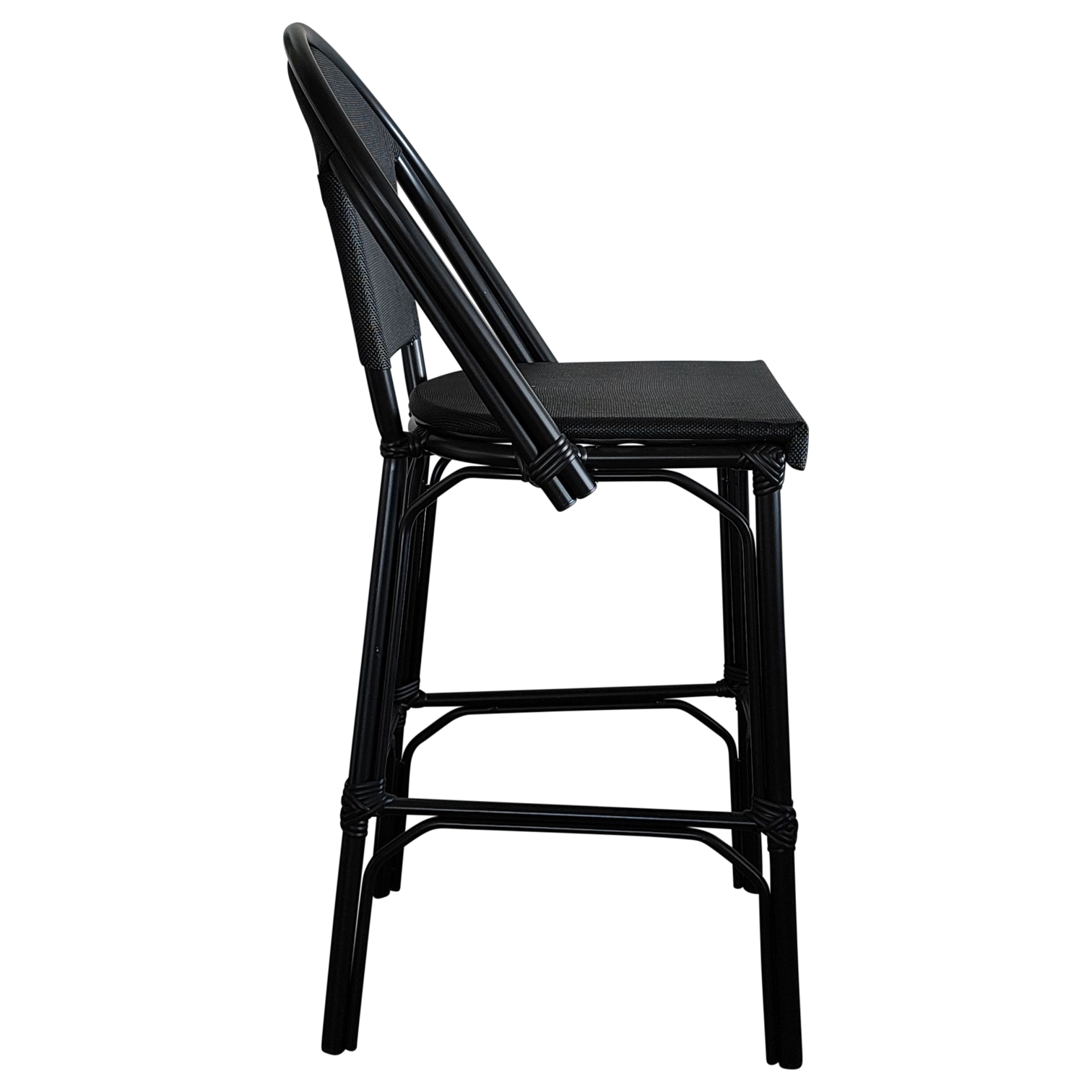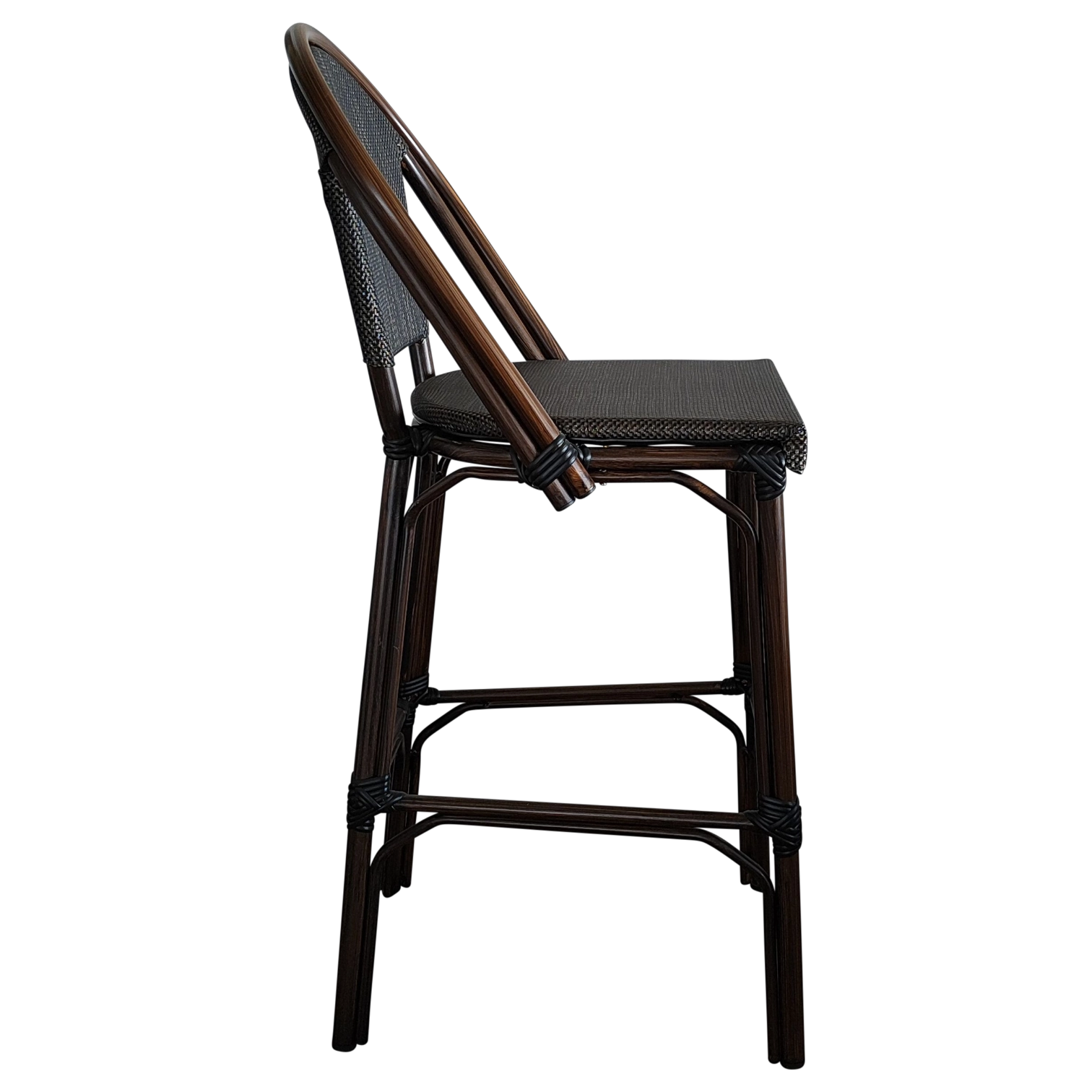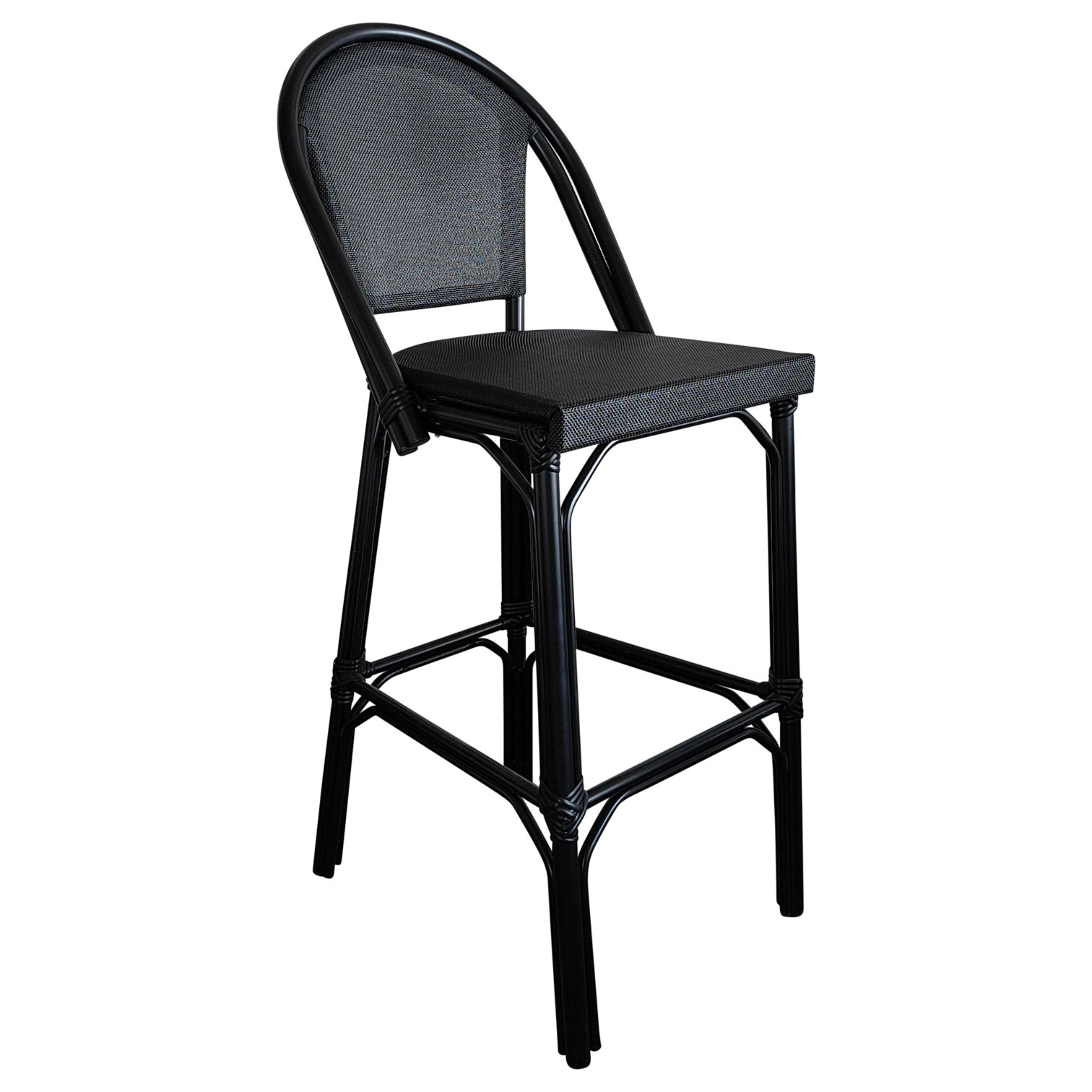 JENA Stool — Stylish rattan-look bar stool with a woven back and seat. Ideal for cafés, bars, and outdoor areas, offering both comfort and charm.