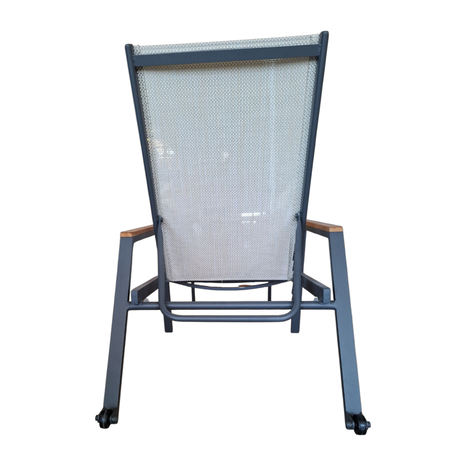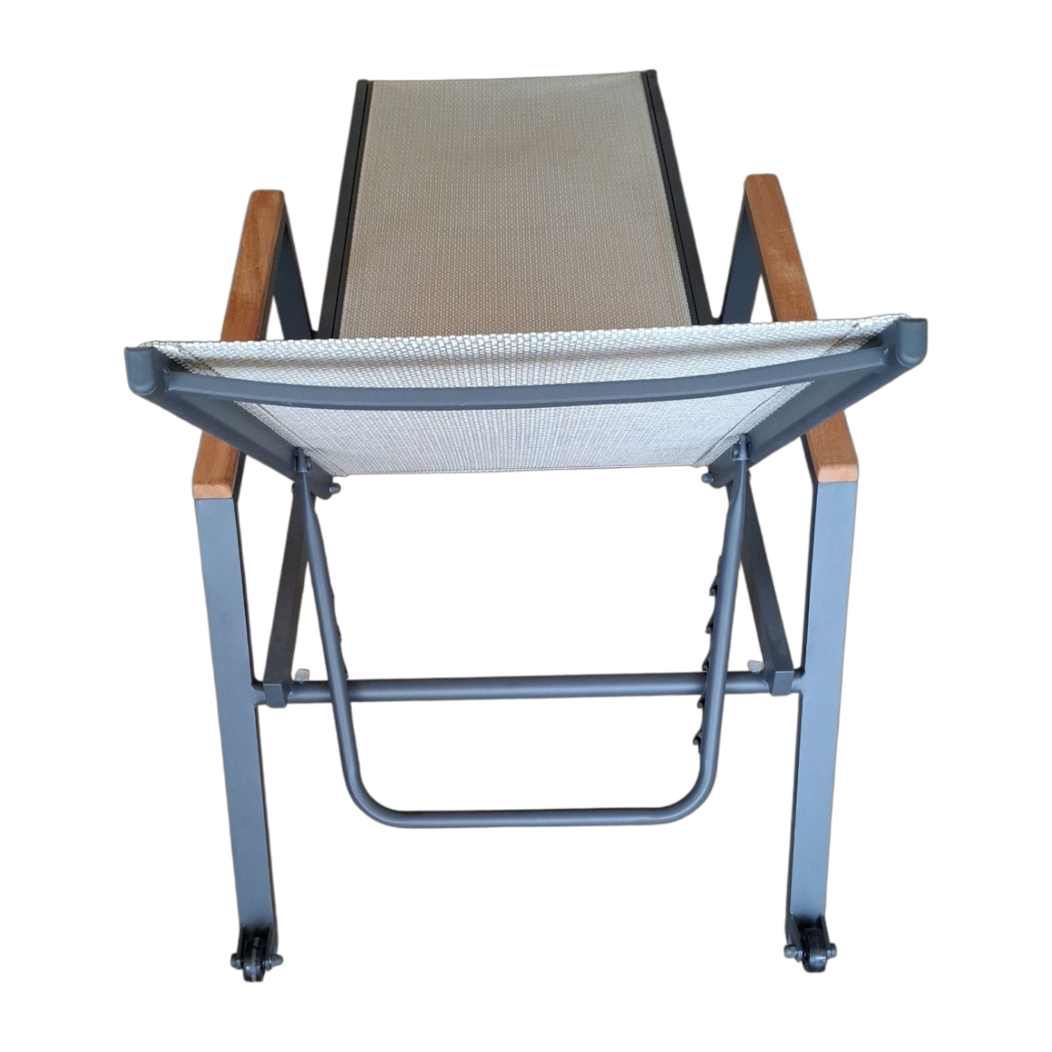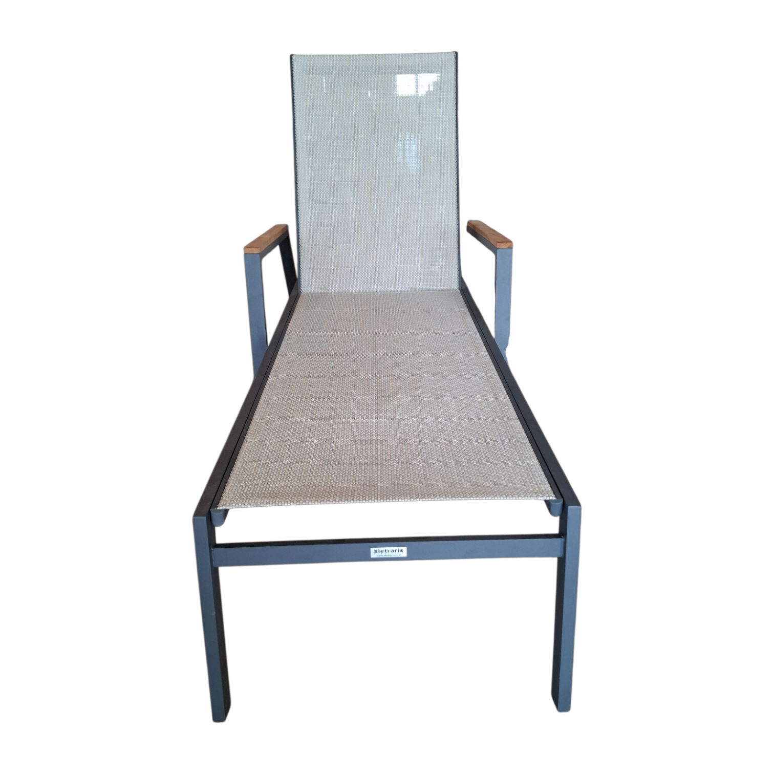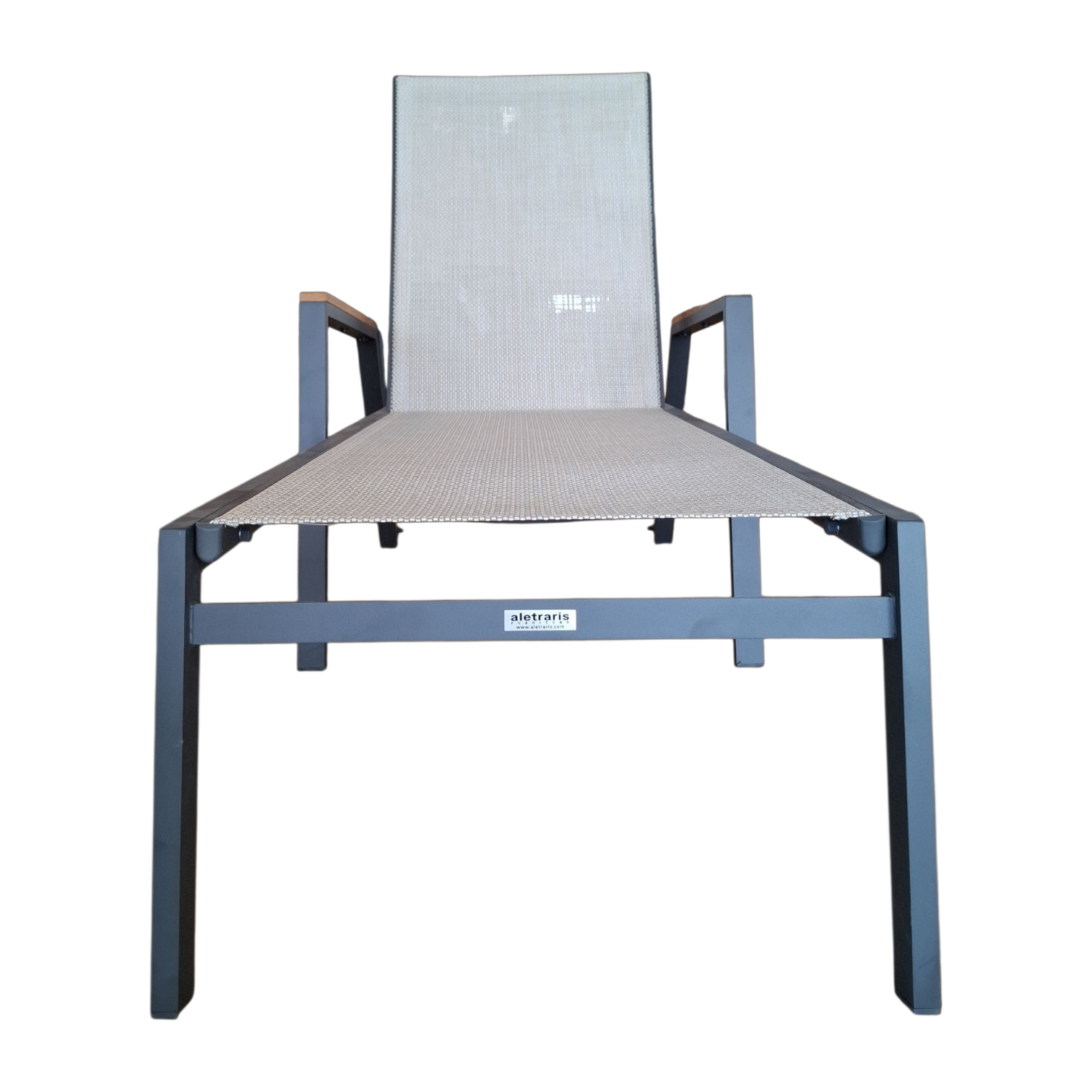 EZREAL Sunbed — Elegant aluminum sun lounger with textilene fabric and teak armrests. Durable and comfortable for pools, gardens, and resorts.