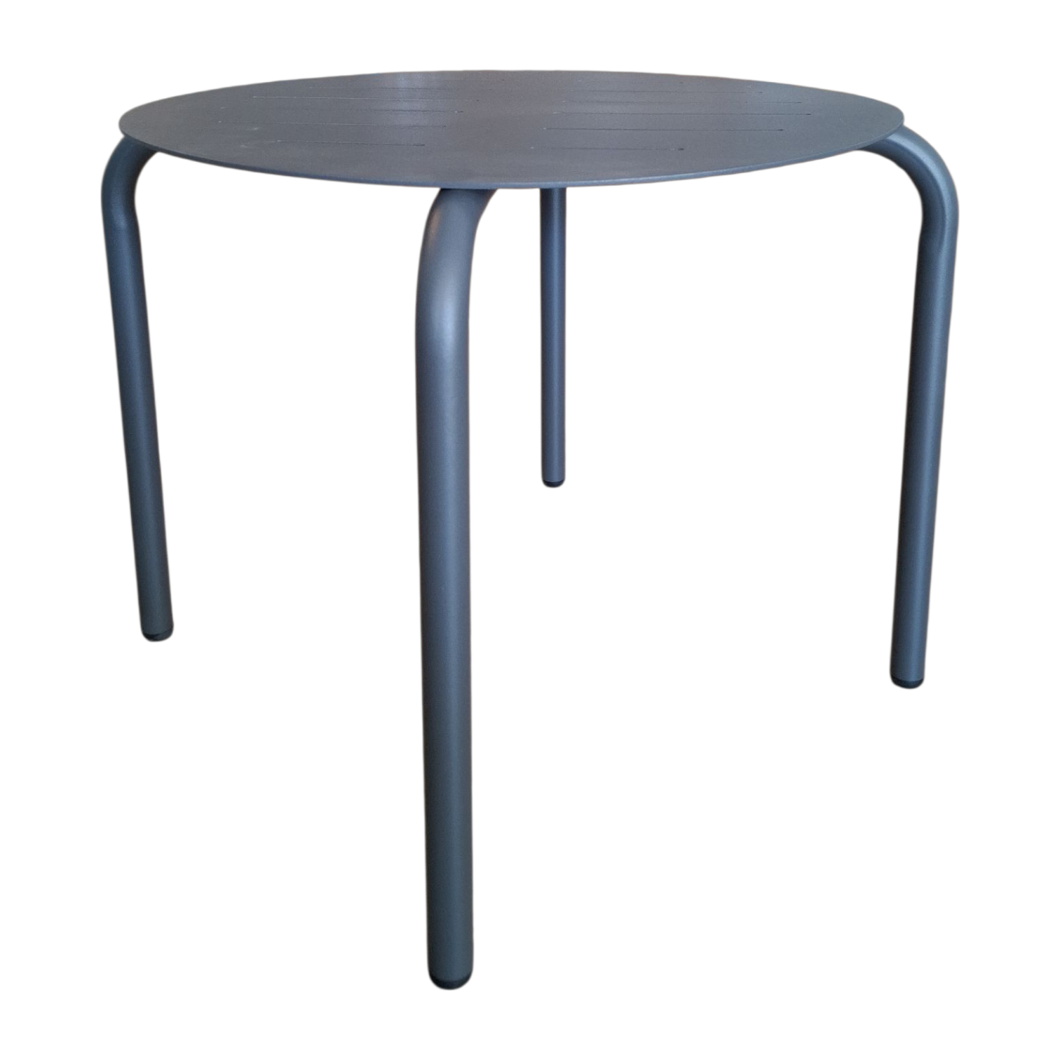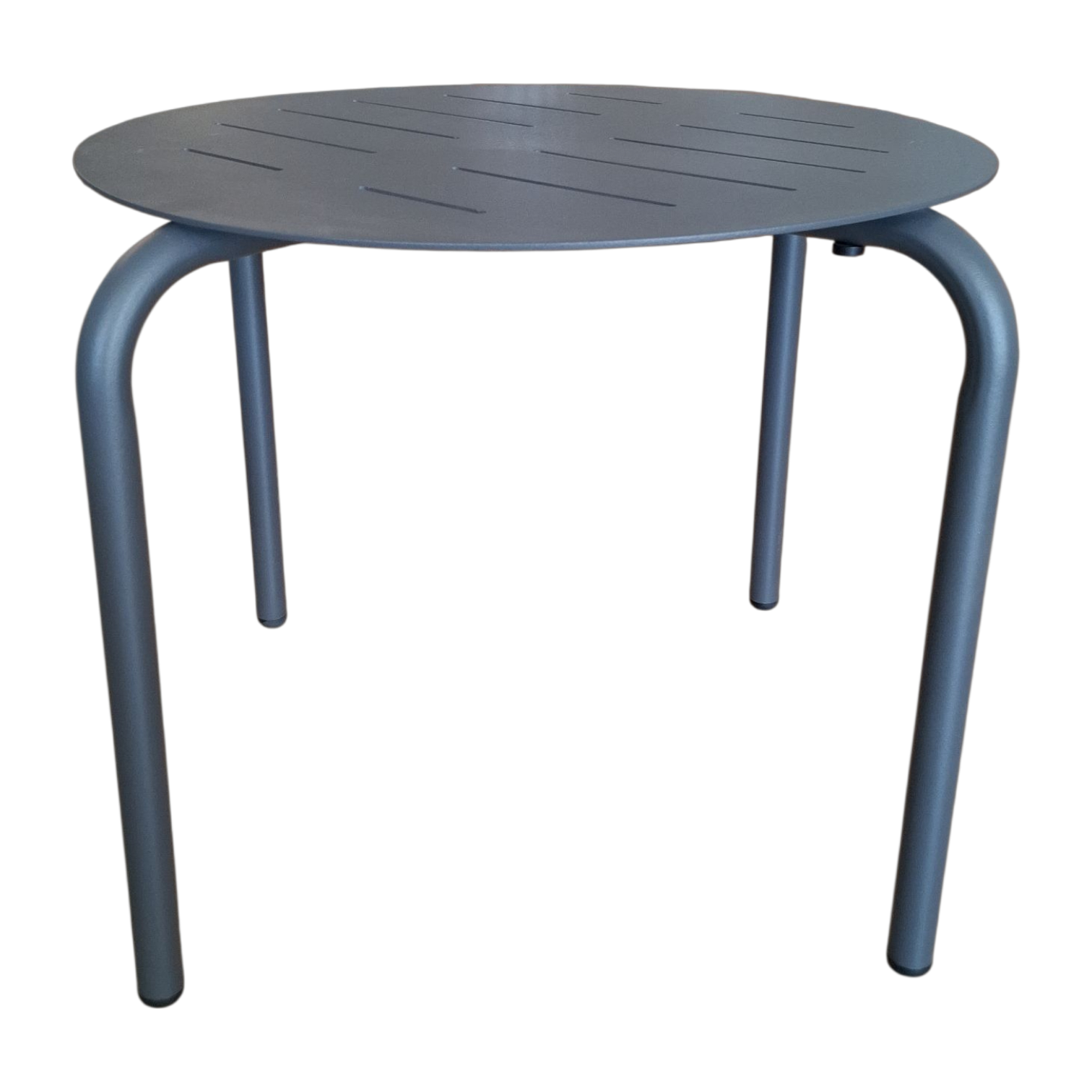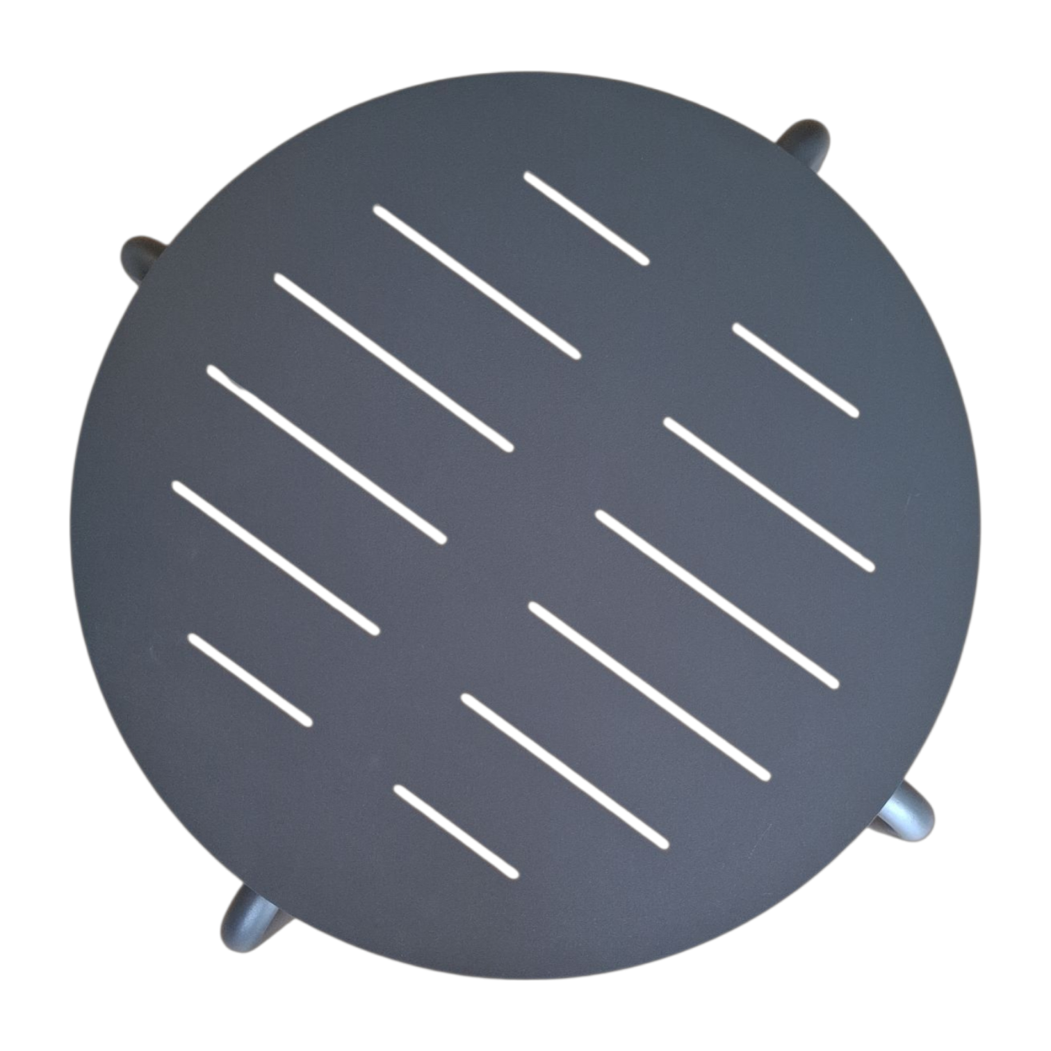 The round tabletop features subtle slotted detailing, providing both style and practicality by allowing water drainage. Its curved legs add a touch of softness to the geometric design while ensuring excellent stability.