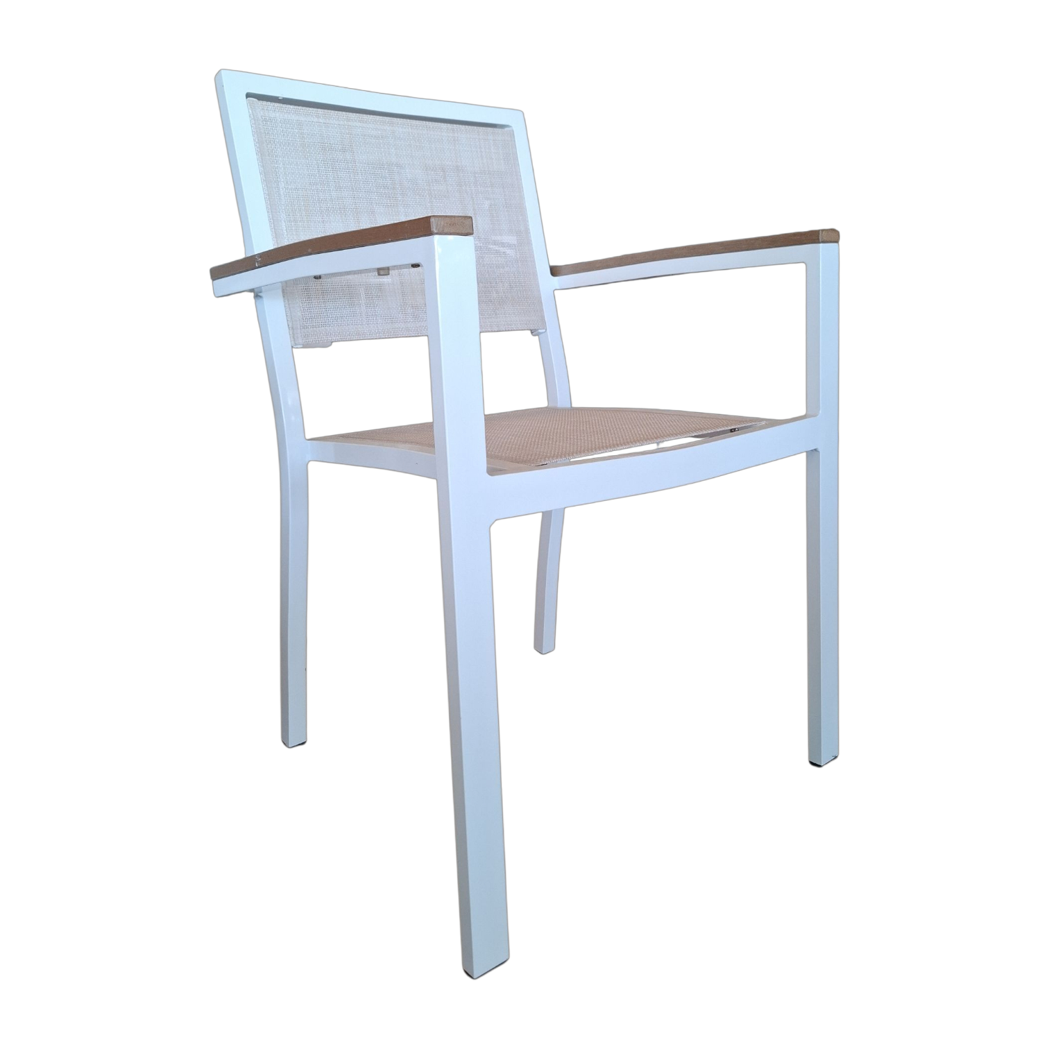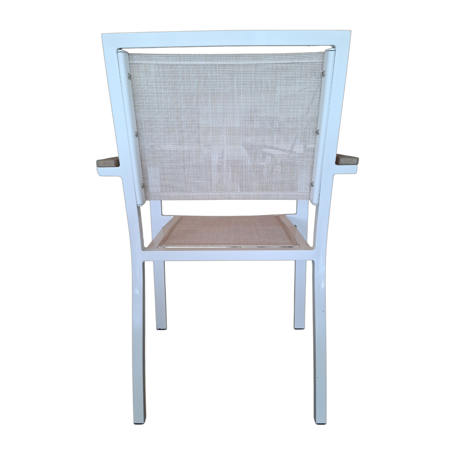 The Porto ArmChair embodies a sleek and contemporary design ideal for modern outdoor and indoor settings. Crafted with a sturdy aluminum frame finished in elegant white, it offers durability and resistance to weathering. The woven seat and backrest provide both comfort and breathability, while the teak armrests add a touch of natural warmth and sophistication. Lightweight yet robust, the Porto Dining Chair perfectly balances functionality and style, making it an excellent choice for patios, dining areas, and commercial spaces alike.