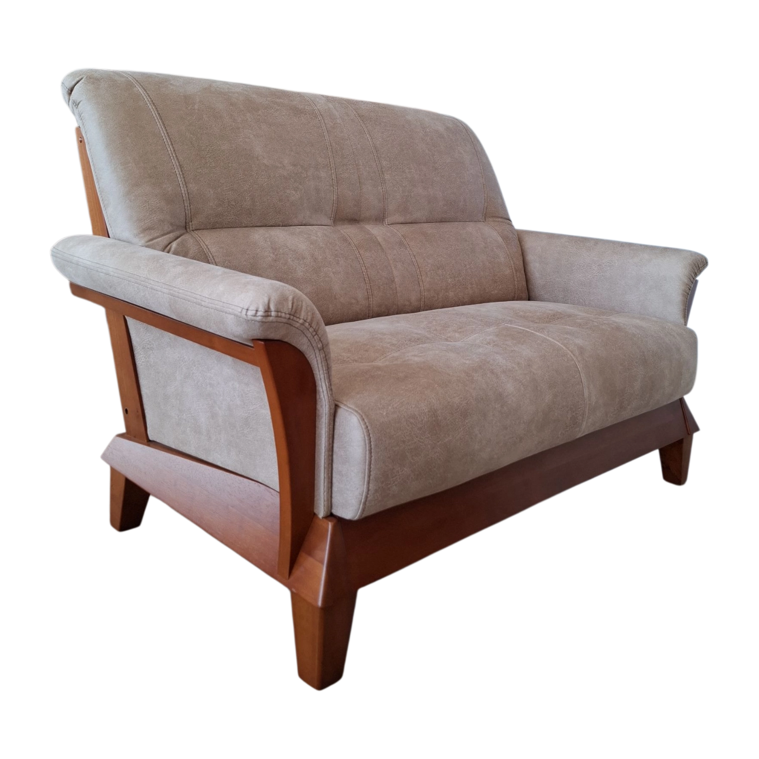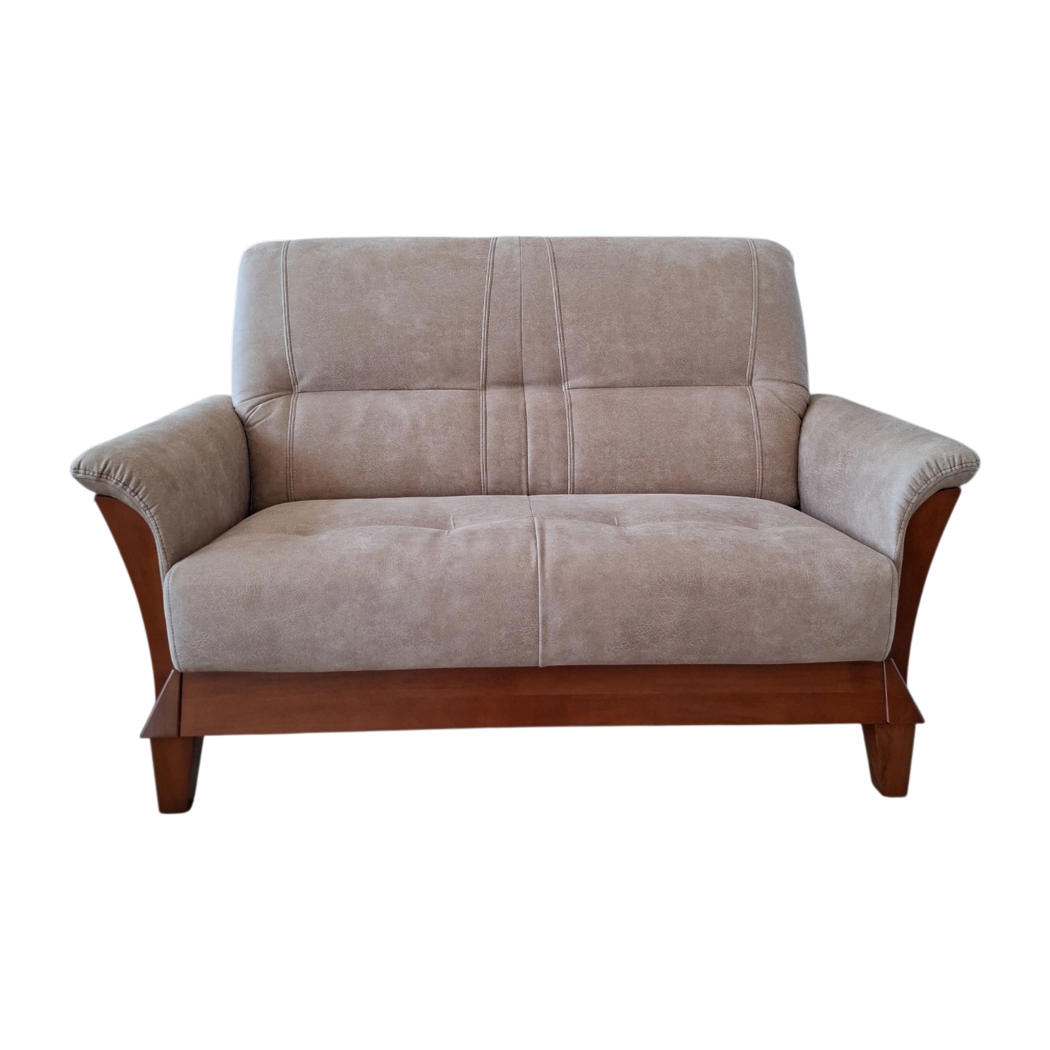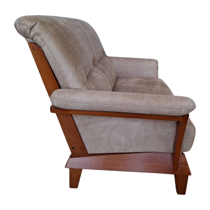 Introducing a classic two-seater sofa featuring a warm, wooden brown frame complemented by mushroom microfibre seats and wooden armrests. This sofa exudes timeless elegance, combining the beauty of wood with comfortable seating and armrests for a cozy and inviting addition to your living space.