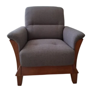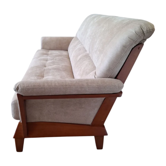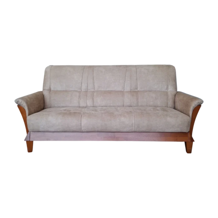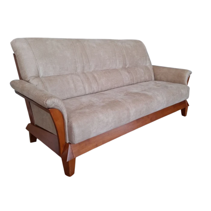 Introducing a classic three-seater sofa featuring a warm, wooden brown frame complemented by brown seats and wooden armrests. This sofa exudes timeless elegance, combining the beauty of wood with comfortable seating and armrests for a cozy and inviting addition to your living space.