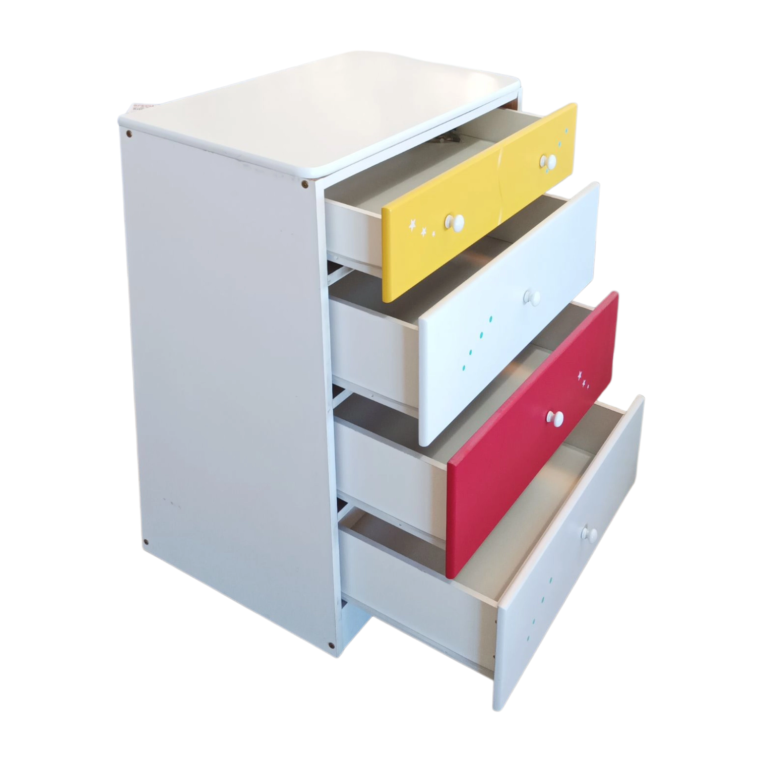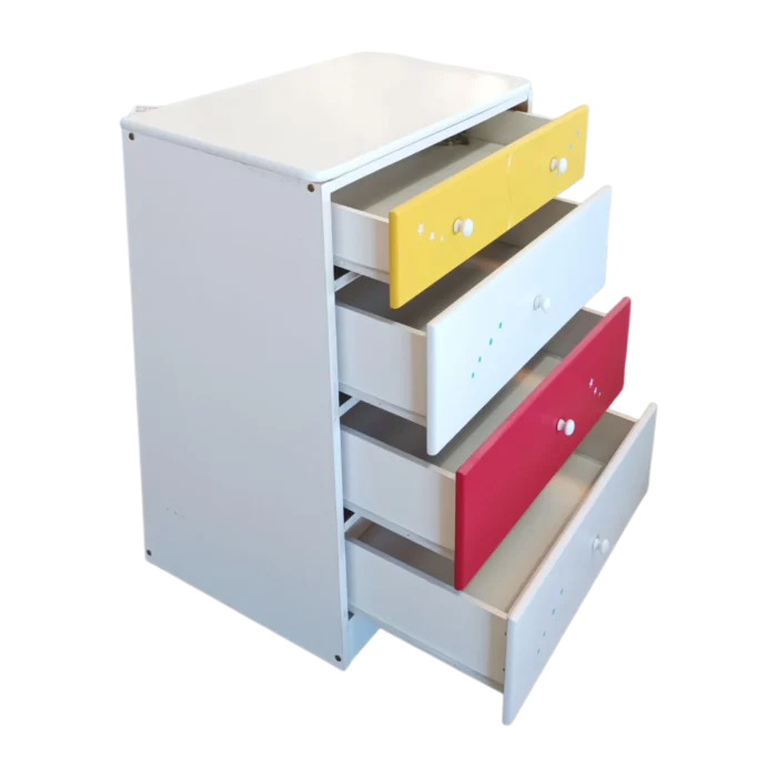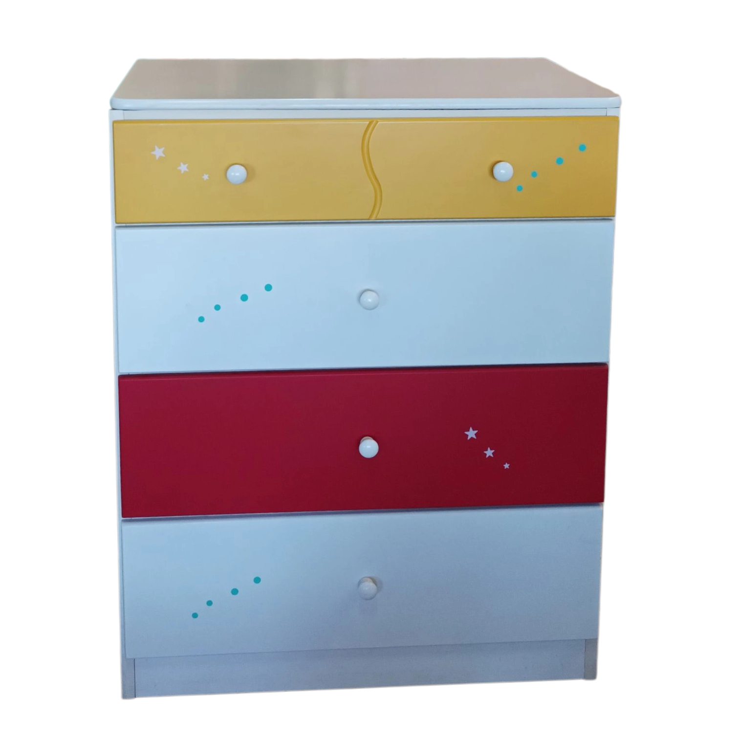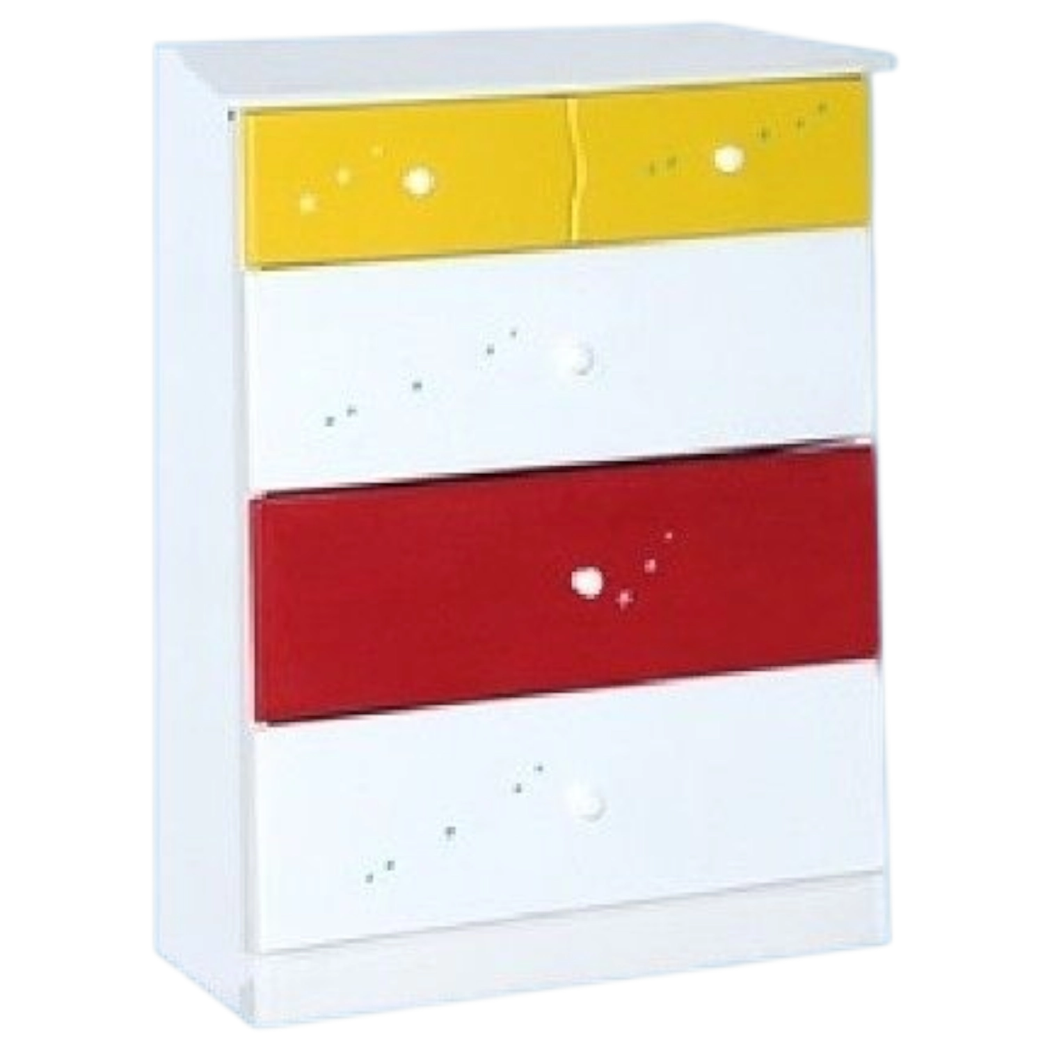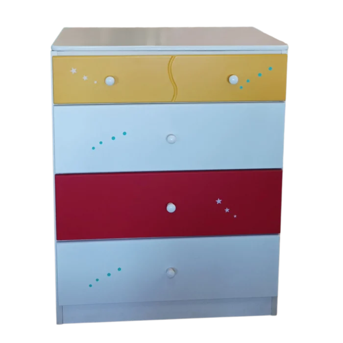Organize their room with a splash of color! This compact dresser features a crisp white frame with four spacious drawers, highlighted by a yellow top drawer, red second-to-last drawer, and white in between—all with charming star details. Ideal for clothes, toys, or extra blankets, bringing a cheerful look to any bedroom.