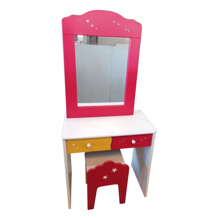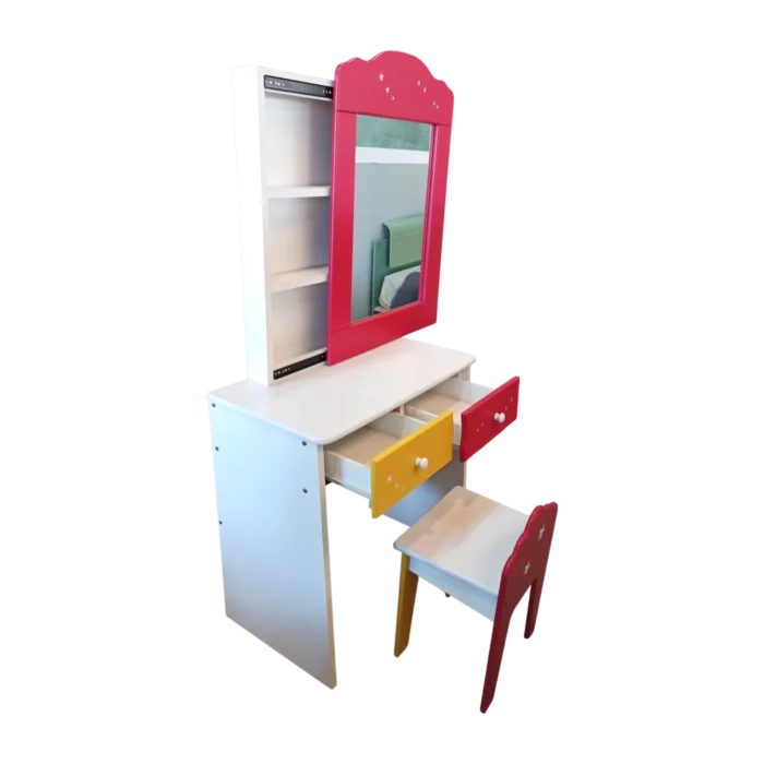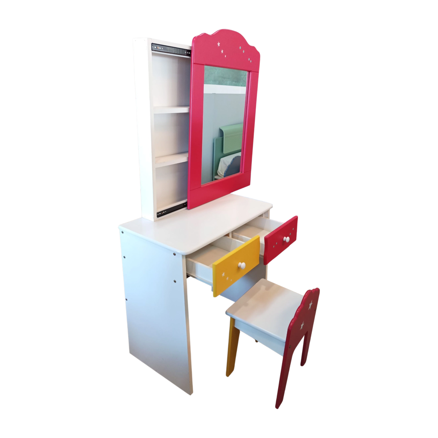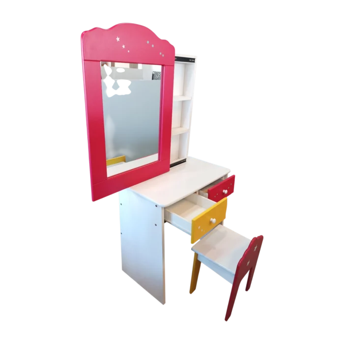 Let imaginations sparkle! This adorable vanity set features a sturdy white desk with a tall red framed mirror (adorned with stars) and handy side shelves. Two colorful drawers (yellow and red) offer space for treasures, completed by a matching white and red stool with yellow legs. Perfect for dress-up, crafts, or story time.