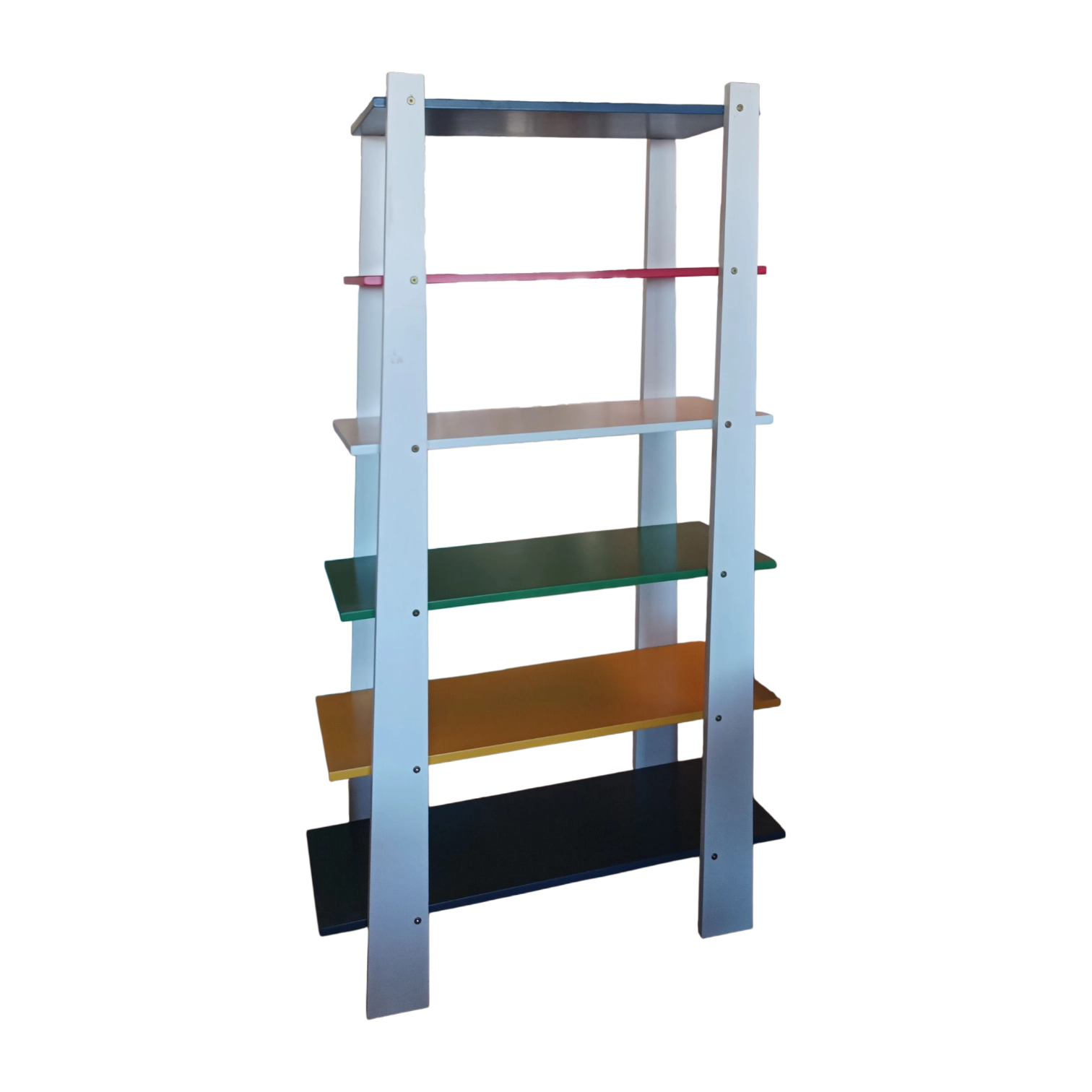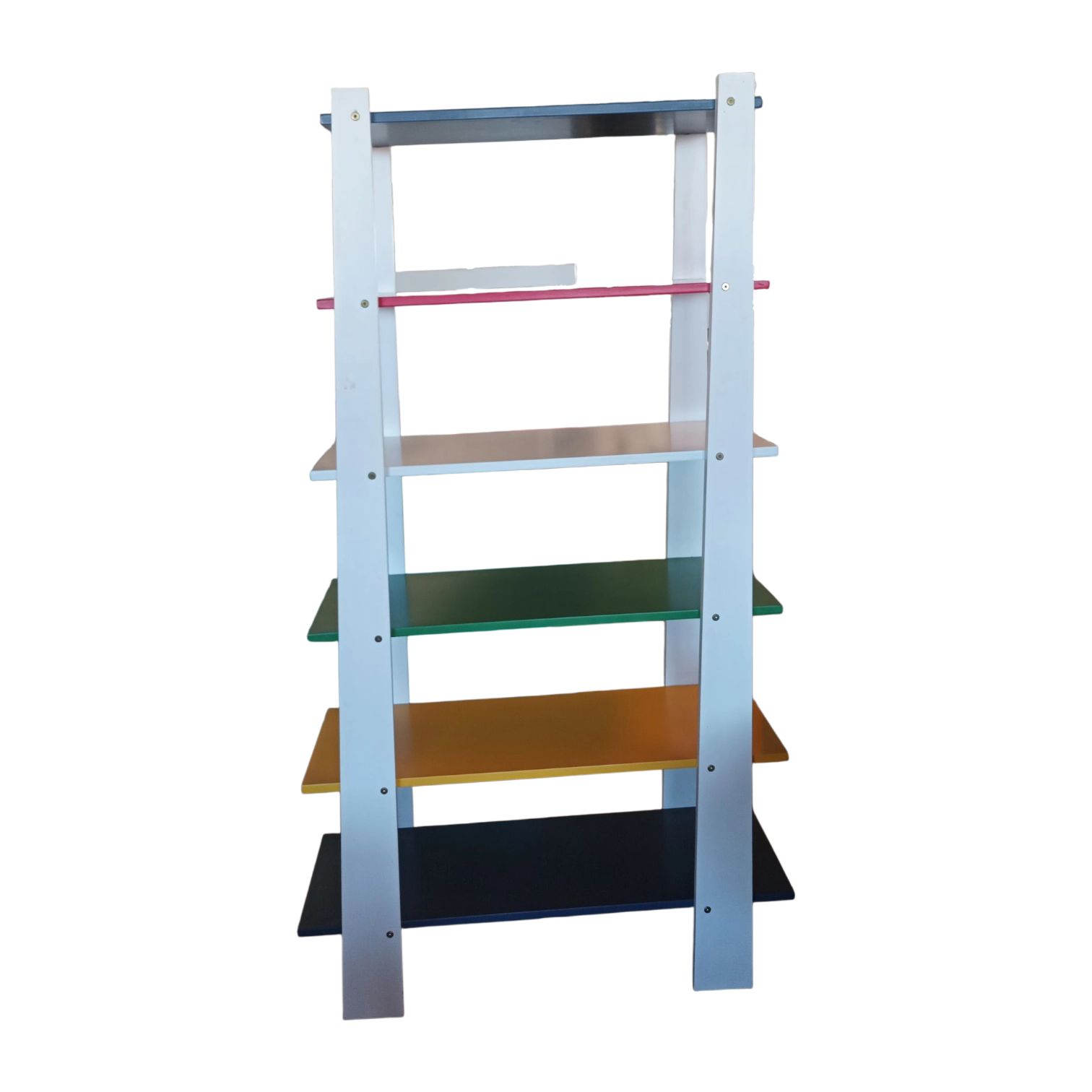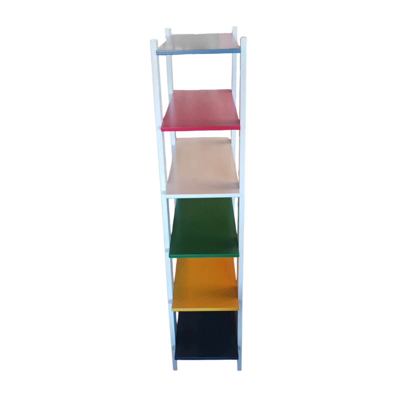 This cool ladder bookcase features a sturdy white frame and five shelves in a vibrant rainbow of colors. It’s the perfect vertical organizer for books, toys, trophies, and games.